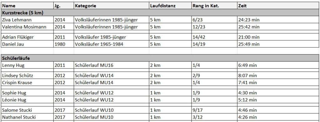 Zuerst gingen Valentina, Ziva, Daniel und Adrian über die 5 km-Strecke an den Start. Alle klassierten sich im guten Mittelfeld und zeigten starke Läufe.