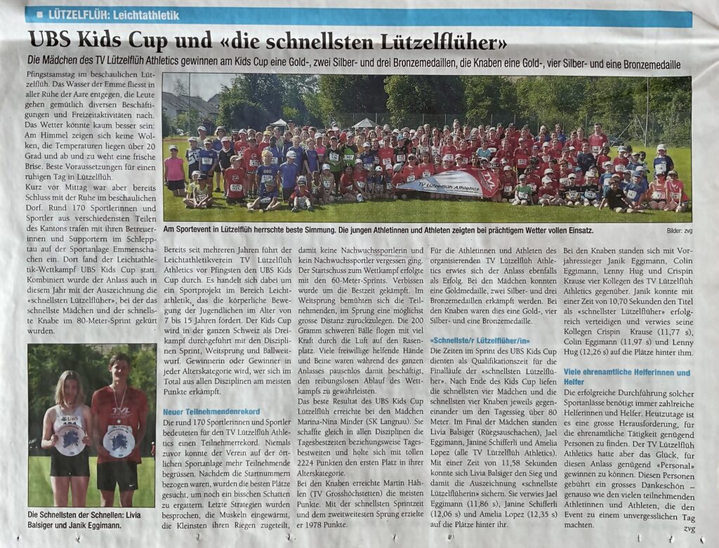 Kurz vor Mittag war aber bereits Schluss mit der Ruhe im beschaulichen Dorf. Rund 170 Sportlerinnen und Sportler aus verschiedensten Teilen des Kantons trafen mit ihren Betreuern und Supportern im Schlepptau auf der Sportanlage Emmenschachen ein. Dort fand der UBS Kids Cup Leichtathletik-Wettkampf statt. Kombiniert wurde der Anlass auch in diesem Jahr mit der Auszeichnung des «schnellsten Lützelflüher», bei welchem das schnellste Mädchen und der schnellste Knabe über 80 Meter Sprint gekürt wurde.